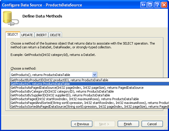 Figure 3: Configure the ObjectDataSource to Retrieve Data Using the GetProducts() Method (Click to view full-size image)