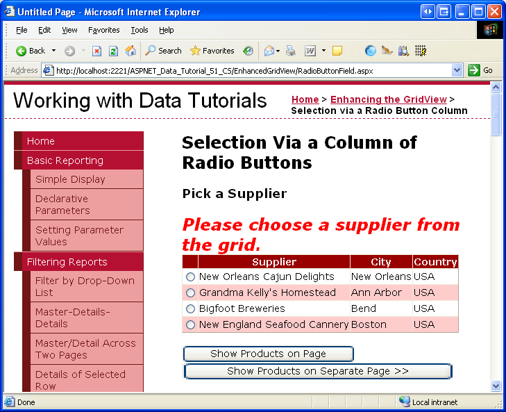 After the user has selected a GridView row, we need to show the selected supplier s products. In some circumstances, we may want to display these products in a separate page, in others we might prefer to do it in the same page. Let s first examine how to display the products in a separate page; in Step 5 we'll look at adding a GridView to RadioButtonField.aspx to display the selected supplier s products.