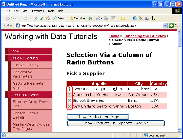 This code works wonderfully as long as one of the radio buttons is selected from the GridView. If, initially, the GridView does not have any radio buttons selected, and the user clicks the SendToProducts button, SuppliersSelectedIndex will be -1, which will cause an exception to be thrown since -1 is out of the index range of the DataKeys collection. This is not a concern, however, if you decided to update the RowCreated event handler as discussed in Step 3 so as to have the first radio button in the GridView initially selected.