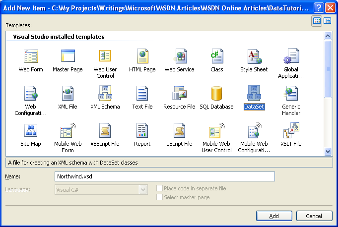 To begin creating our DAL, we start by adding a Typed DataSet to our project. To accomplish this, right-click on the project node in the Solution Explorer and choose Add a New Item. Select the DataSet option from the list of templates and name it Northwind.xsd.