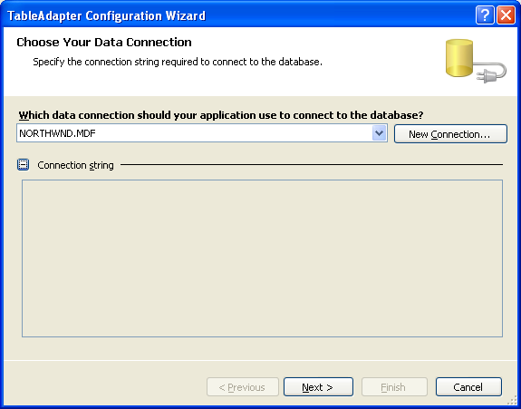 After clicking Add, when prompted to add the DataSet to the App_Code folder, choose Yes. The Designer for the Typed DataSet will then be displayed, and the TableAdapter Configuration Wizard will start, allowing you to add your first TableAdapter to the Typed DataSet.