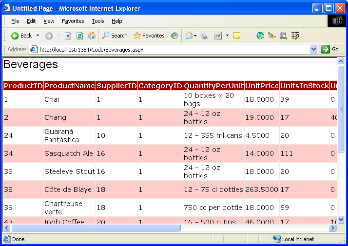 Each object used in this example is also strongly-typed, allowing Visual Studio to provide IntelliSense and compile-time type checking. And best of all the DataTables returned by the TableAdapter can be bound to ASP.NET data Web controls, such as the GridView, DetailsView, DropDownList, CheckBoxList, and several others. The following example illustrates binding the DataTable returned by the GetProducts() method to a GridView in just a scant three lines of code within the Page_Load event handler.