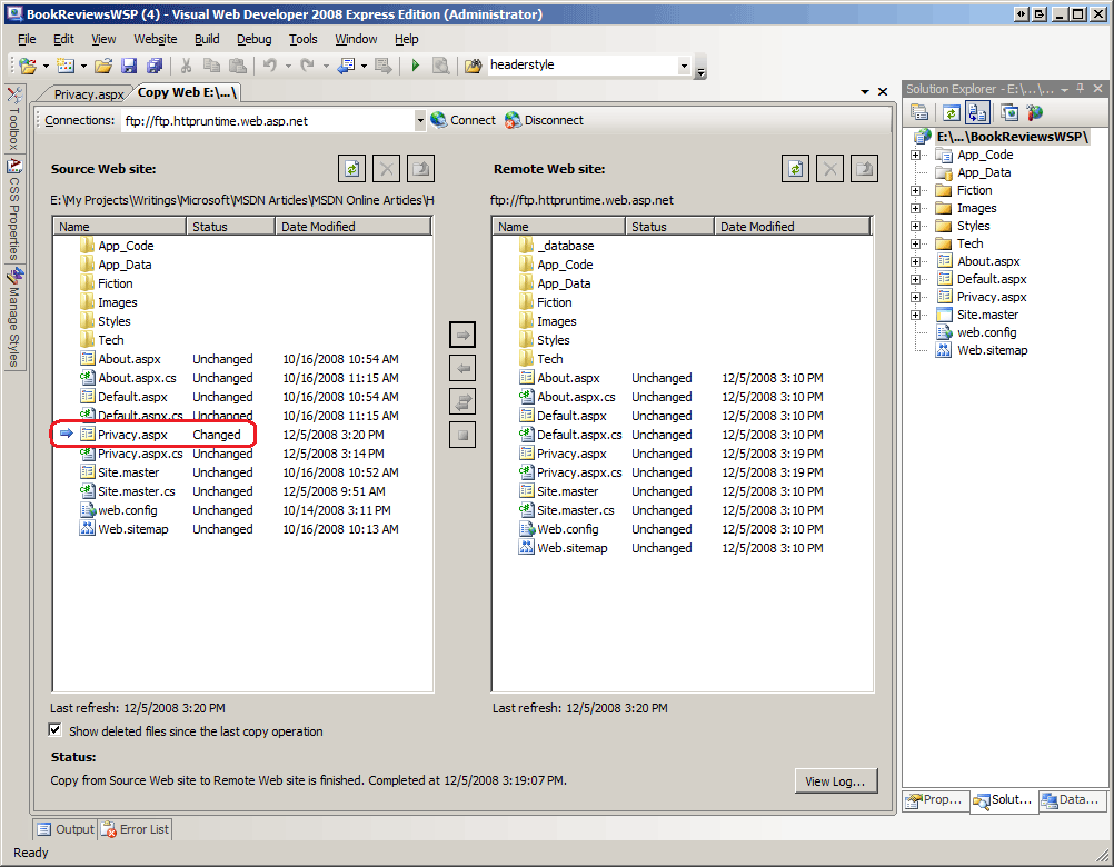 Along with listing new files, the Copy Web Site tool highlights any files that differ between the local and remote sites. To see this in action, return to the Privacy.aspx page and add a few more words to the privacy policy. Save the page and then return to the Copy Web Site tool. As Figure 5 shows, the Privacy.aspx page in the left pane has a status of Changed indicating that it is out of sync with the remote site.