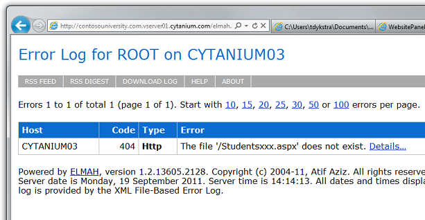 Make sure that Elmah has write access to the Elmah folder by causing an error and then displaying the Elmah error report. Request an invalid URL like Studentsxxx.aspx. As before, you see the GenericErrorPage.aspx page. Click the Log Out link, and then run Elmah.axd. You get the Log In page first, which validates that the Web.config transform successfully added Elmah authorization. After you log in, you see the report that shows the error you just caused.