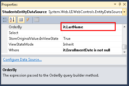 You also want this list to be in name order when it's first displayed. With the Students.aspx page still open in Design view, and with the EntityDataSource control still selected, in the Properties window set the OrderBy property to it.LastName.