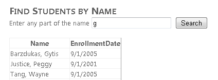 Enter the letter "g" in the text box and click Search. You see a list of students that have a "g" in either the first or last name.