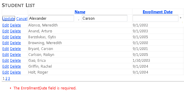 Open the Students.aspx page and in the StudentsGridView control replace the Name and Enrollment Date TemplateField elements with the following markup: