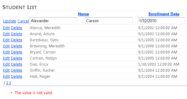 For now, notice that Dynamic Data automatically provides basic data validation. For example, click Edit, clear the date field, click Update, and you see that Dynamic Data automatically makes this a required field because the value is not nullable in the data model. The page displays an asterisk after the field and an error message in the ValidationSummary control: