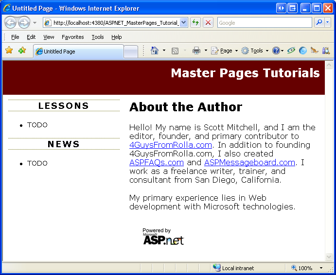 Take a moment to create some content for the About.aspx page. As you can see in Figure 10, I entered an "About the Author" heading and a couple of paragraphs of text, but feel free to add Web controls, too. After creating this interface, visit the About.aspx page through a browser.