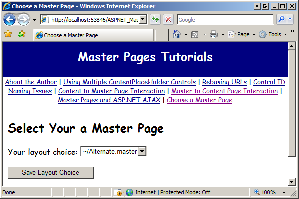 With this code in place, visit the ChooseMasterPage.aspx page. Initially, the Site.master master page is selected (see Figure 6), but the user can pick a different master page from the drop-down list.