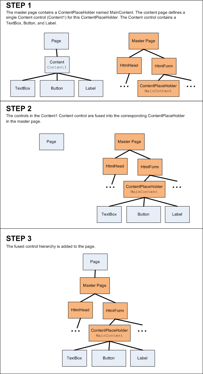 Figure 1 illustrates this fusion. Step 1 in Figure 1 shows the initial content and master page control hierarchies. At the tail end of the PreInit stage the Content controls in the page are added to the corresponding ContentPlaceHolders in the master page (Step 2). After this fusion, the master page serves as the root of the fused control hierarchy. This fused control hierarchy is then added to the page to produce the finalized control hierarchy (Step 3). The net result is that the page's control hierarchy includes the fused control hierarchy.