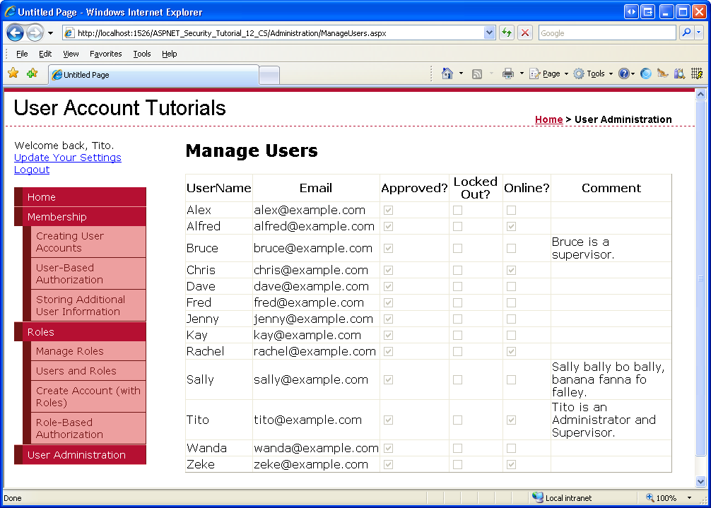 Take a moment to test the page through a browser. As Figure 4 shows, the UserAccounts GridView lists the username, email address, and other pertinent account information for all users in the system.