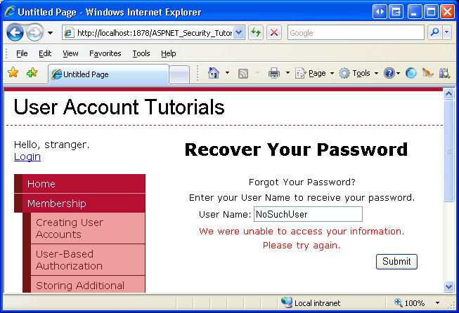 Once you have configured the SMTP settings, visit the RecoverPassword.aspx page through a browser. First try entering a username that doesn't exist in the user store. As Figure 2 shows, the PasswordRecovery control displays a message indicating that the user information could not be accessed. The text of the message can be customized through the control's UserNameFailureText property.