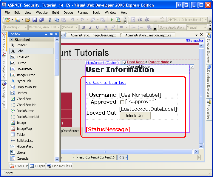 IsApproved. Set itsAutoPostBackproperty toTrue. - A Label control for displaying the user's last locked out date. Name this Label