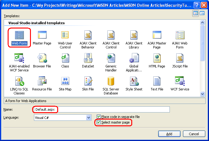 Next, right-click on the project name in the Solution Explorer and choose to add a new Web Form named Default.aspx. This time, check the "Select master page" checkbox and choose the Site.master master page from the list.