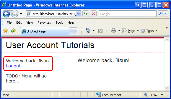 Figure 18: Default.aspx Shows "Welcome Back, Jisun" Along with a "Logout" LinkButton (Click to view full-size image)