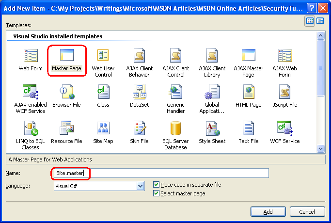 Figure 3: Add a Master Page Named Site.master to the Website (Click to view full-size image)