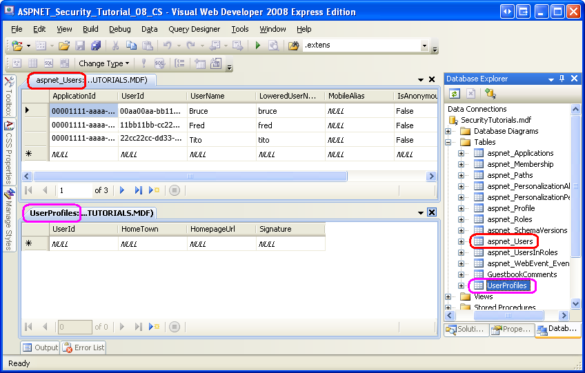Figure 11: The Contents of the aspnet_Users and UserProfiles Tables are Displayed (Click to view full-size image)