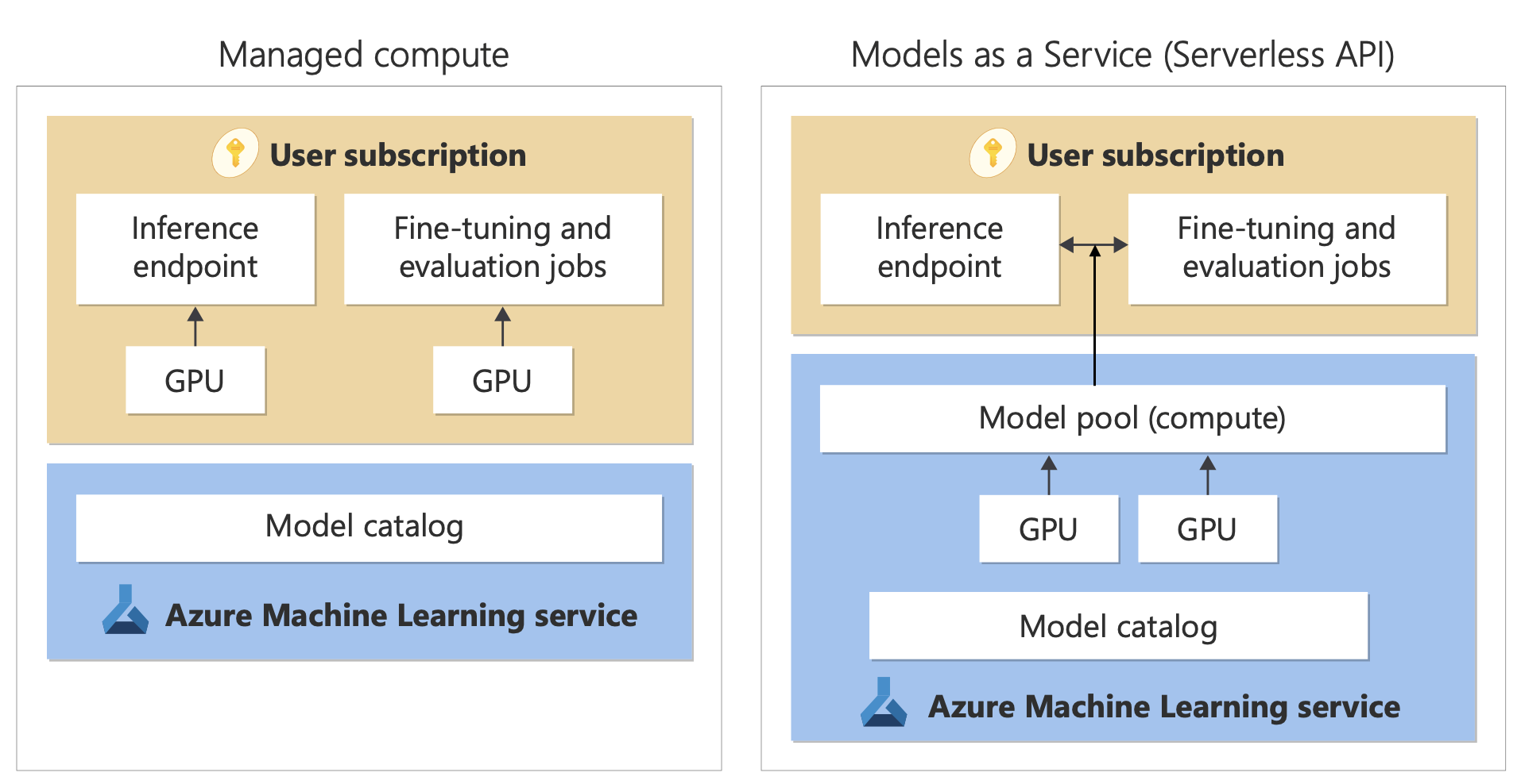 | Deployment experience and billing | Model weights are deployed to dedicated virtual machines with managed compute. A managed compute, which can have one or more deployments, makes available a REST API for inference. You're billed for the virtual machine core hours that the deployments use. | Access to models is through a deployment that provisions an API to access the model. The API provides access to the model that Microsoft hosts and manages, for inference. You're billed for inputs and outputs to the APIs, typically in tokens. Pricing information is provided before you deploy. |