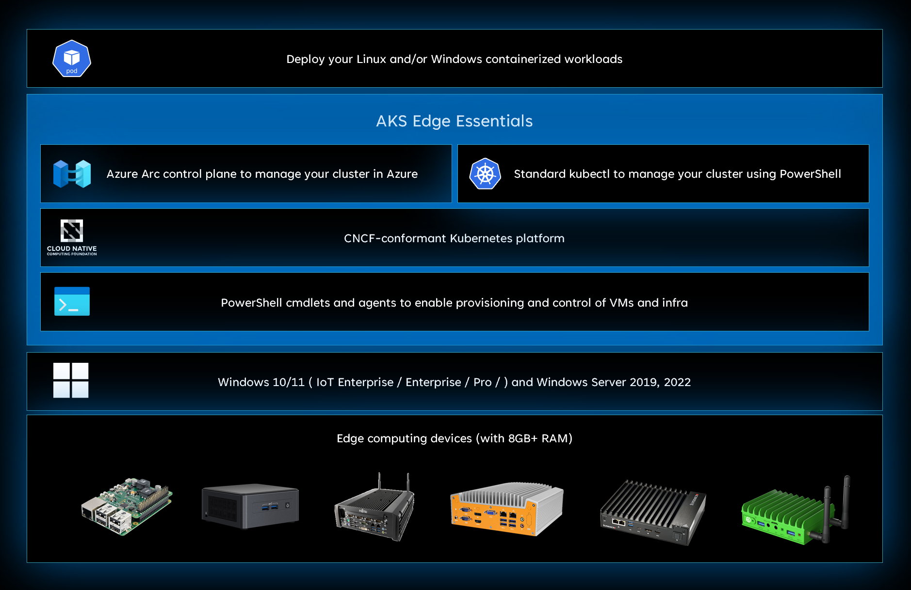 Azure Kubernetes Service Edge Essentials is an on-premises Kubernetes implementation of Azure Kubernetes Service (AKS) that automates running containerized applications at scale. AKS Edge Essentials includes a Microsoft-supported Kubernetes platform that includes a lightweight Kubernetes distribution with a small footprint and simple installation experience, making it easy for you to deploy Kubernetes on PC-class or "light" edge hardware. AKS Edge Essentials makes it easier to get started with your containerized application, bringing cloud-native best practices to your edge application.