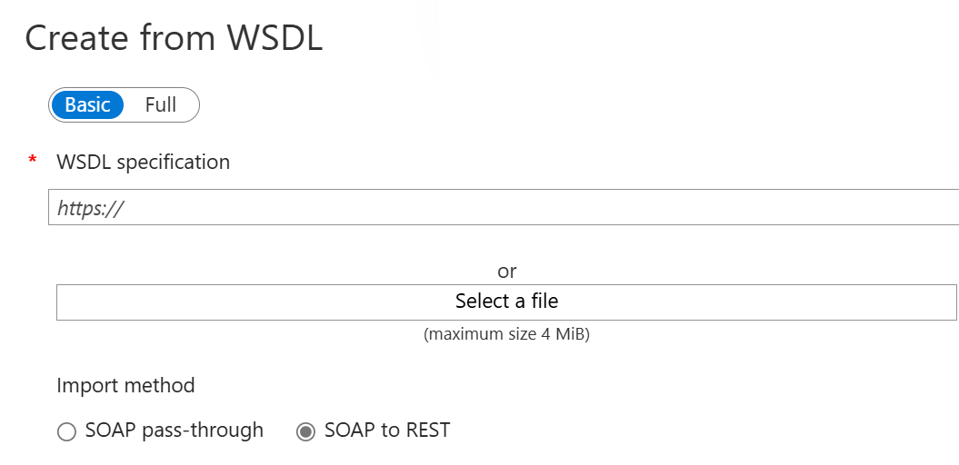 5. Under Import method, select SOAP to REST. When this option is selected, API Management attempts to make an automatic transformation between XML and JSON. In this case, consumers should call the API as a RESTful API, which returns JSON. API Management converts each request to a SOAP call.