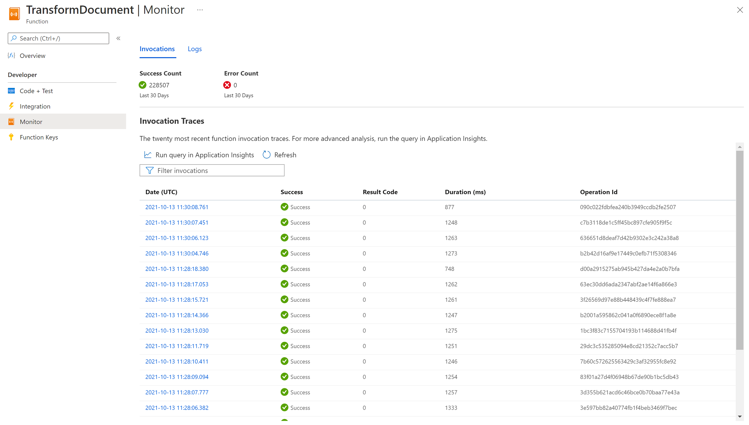 Host.Resultscategory, all the host execution information is gathered in therequestsApplication Insights table. All the invocations results are shown in the function Monitor dashboard and in Application Insights dashboards.For the function called