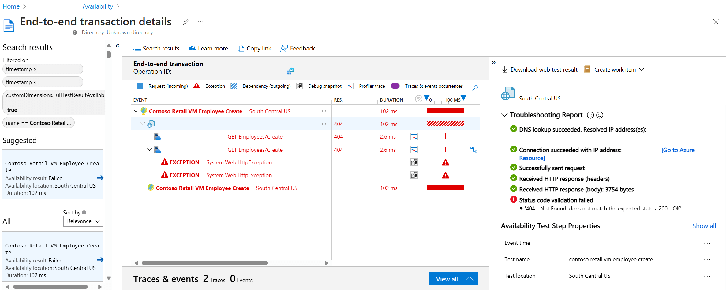 - Diagnose failure with correlated server-side telemetry collected while processing the failed availability test.