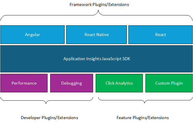 Conceptual diagram that shows the Application Insights JavaScript SDK, its plugins/extensions, and their relationship to each other.