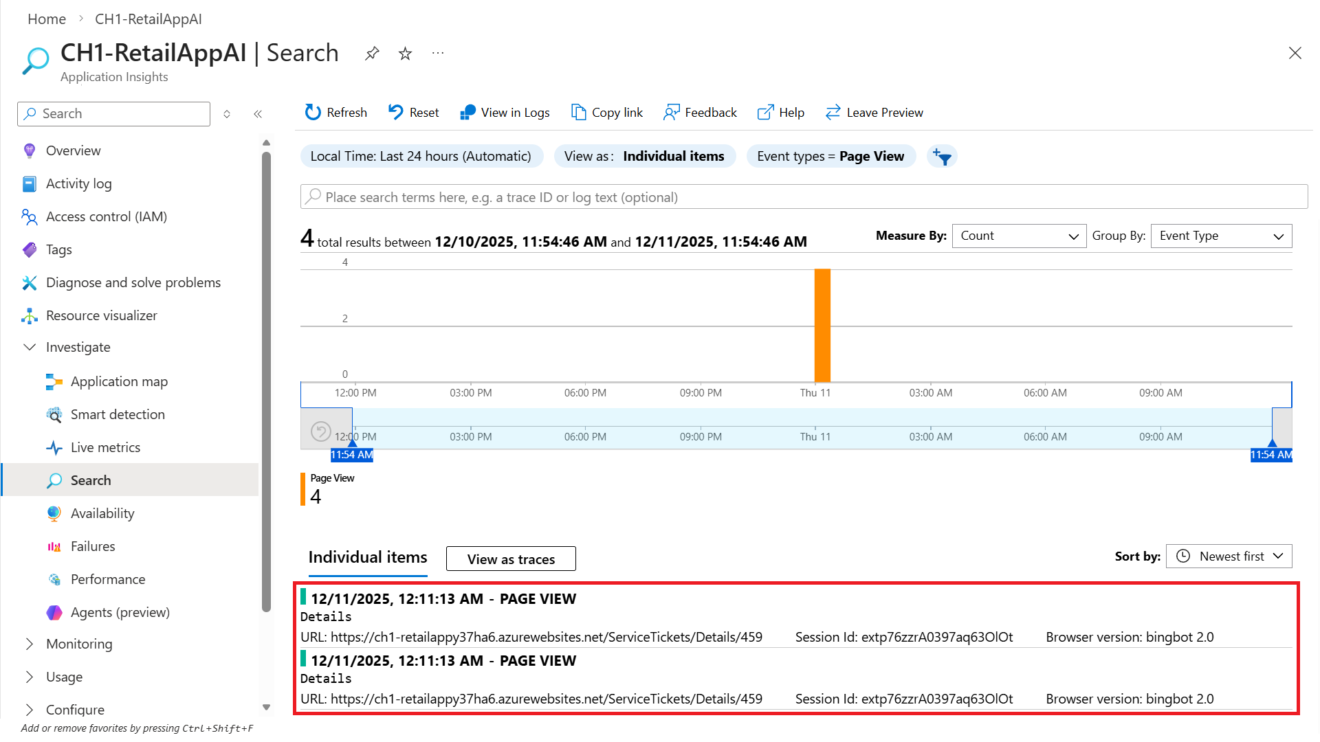 Screenshot of the Application Insights Search pane in the Azure portal with the Page View option selected. The page views are highlighted.