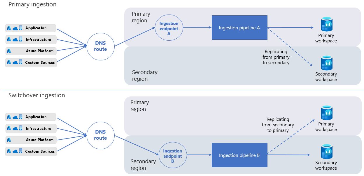 • The failover process updates your Domain Name System (DNS) records to reroute all ingestion requests to your secondary region for processing. Some HTTP clients have "sticky connections" and might take longer to pick up on DNS updates. During switchover, these clients might attempt to ingest logs through the primary region for some time. You might be ingesting logs to your primary workspace using various clients, including the legacy Log Analytics Agent, Azure Monitor Agent, code (using the Logs Ingestion API or the legacy HTTP data collection API), and other services, such as Microsoft Sentinel.