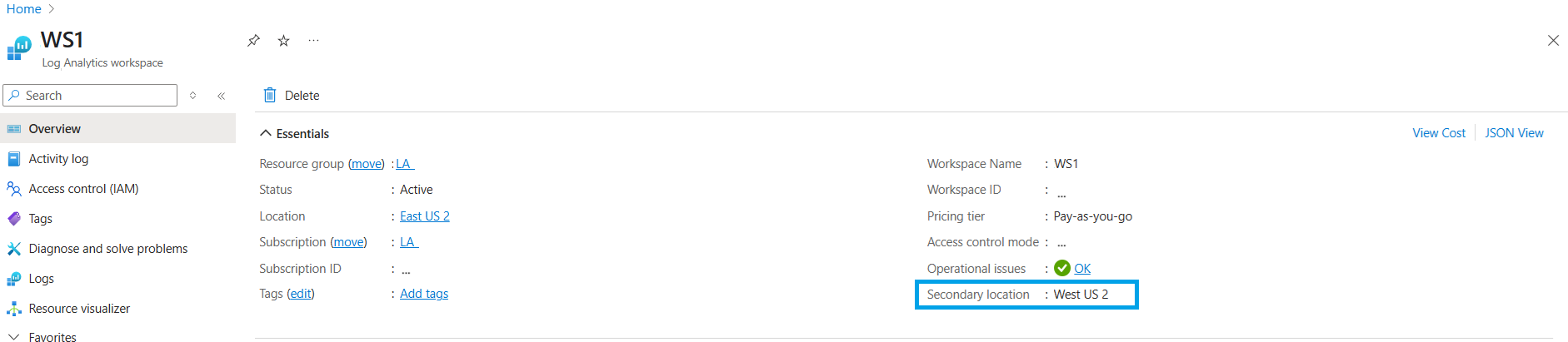 The secondary workspace is a "shadow" workspace for resilience purposes only. You can't see the secondary workspace in the Azure portal, and you can't manage or access it directly.