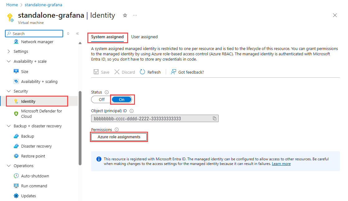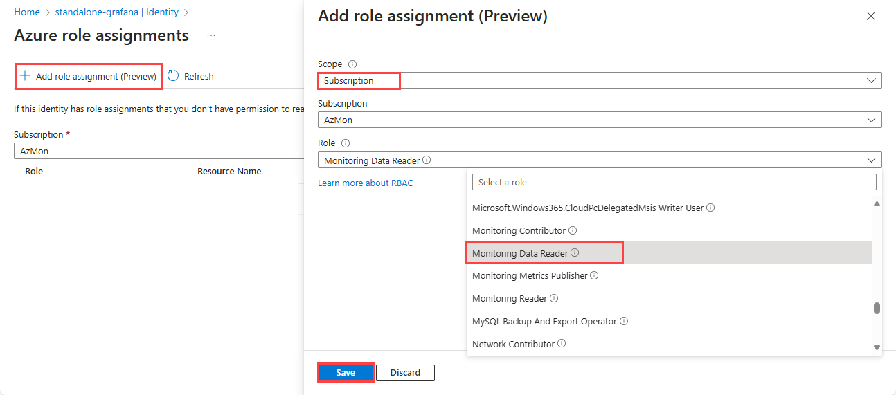 An Azure Managed Grafana instance is automatically configured with a managed identity with the Monitoring Data Reader role required to allow the identity to read any monitoring data for the subscription. The identity is used to authenticate Grafana to Azure Monitor.