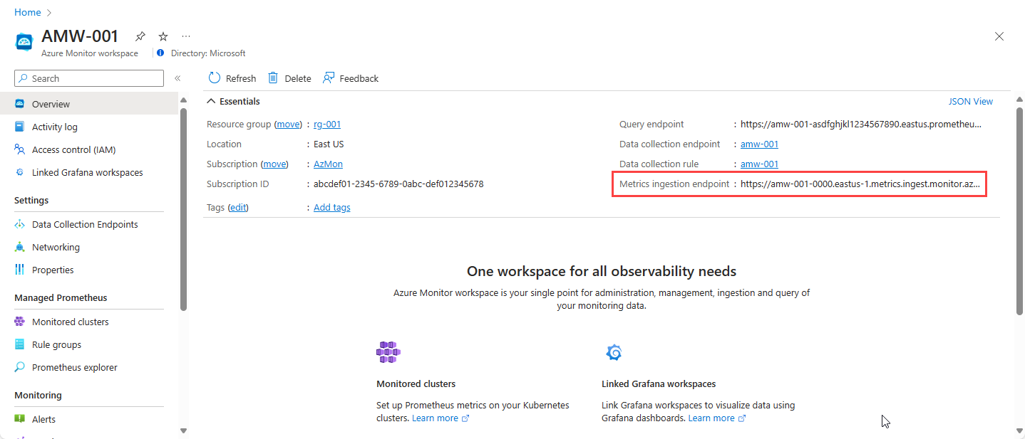 Screenshot that shows the metrics ingestion endpoint for an Azure Monitor workspace.