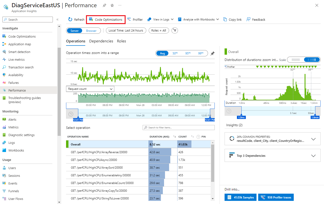 @code_optimizations /connect <YOUR_APPLICATION_INSIGHTS_RESOURCE_NAME_OR_APPLICATION_ID>The command pulls the top issues from Code Optimizations, maps them to source code in your local repo, and suggests fixes/recommendations. It automatically generates the top recommendation.