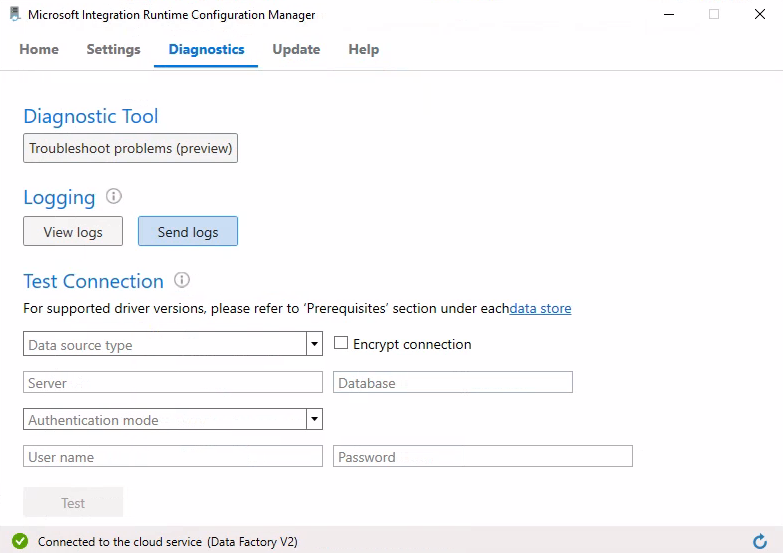 Screenshot of the send logs button on the self-hosted integration runtime (SHIR) to upload logs to Microsoft.