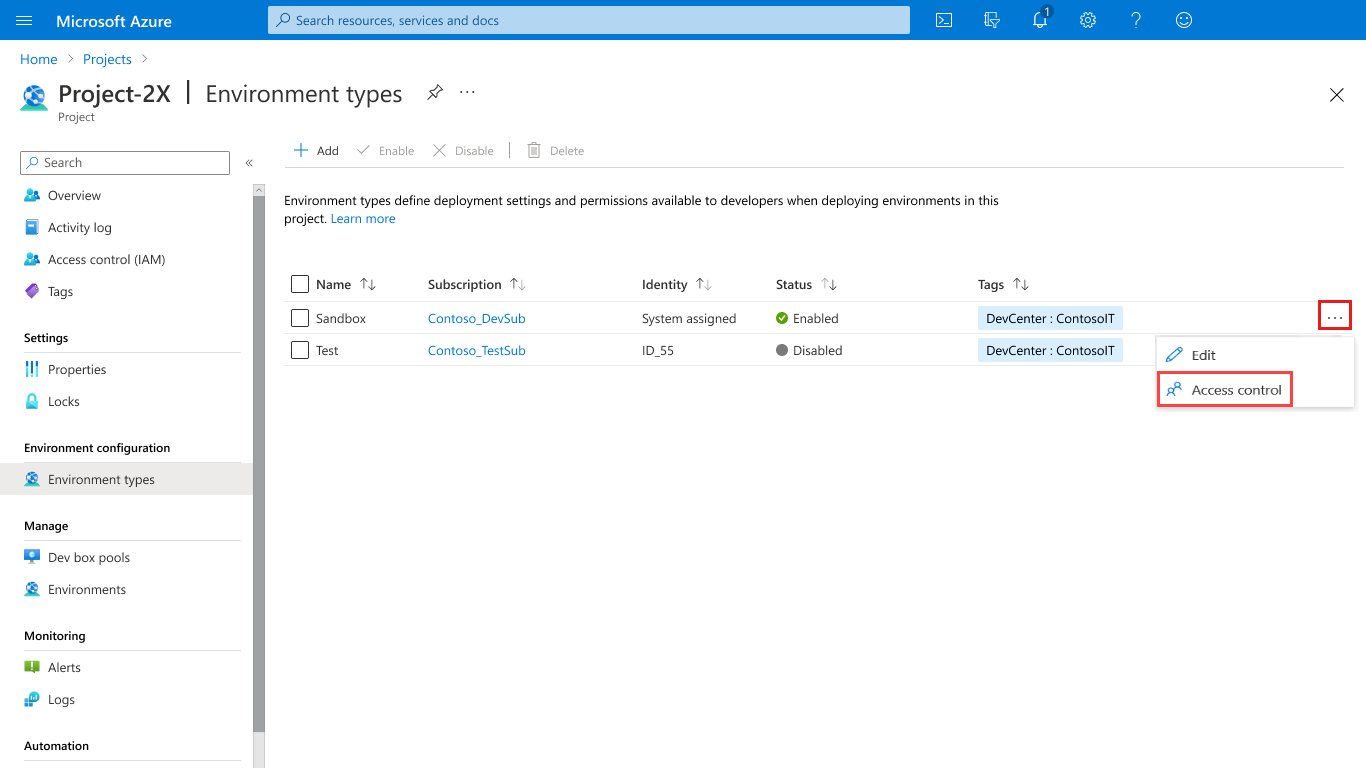 2. Select the ellipsis (...) next to the environment type, and choose Access control.