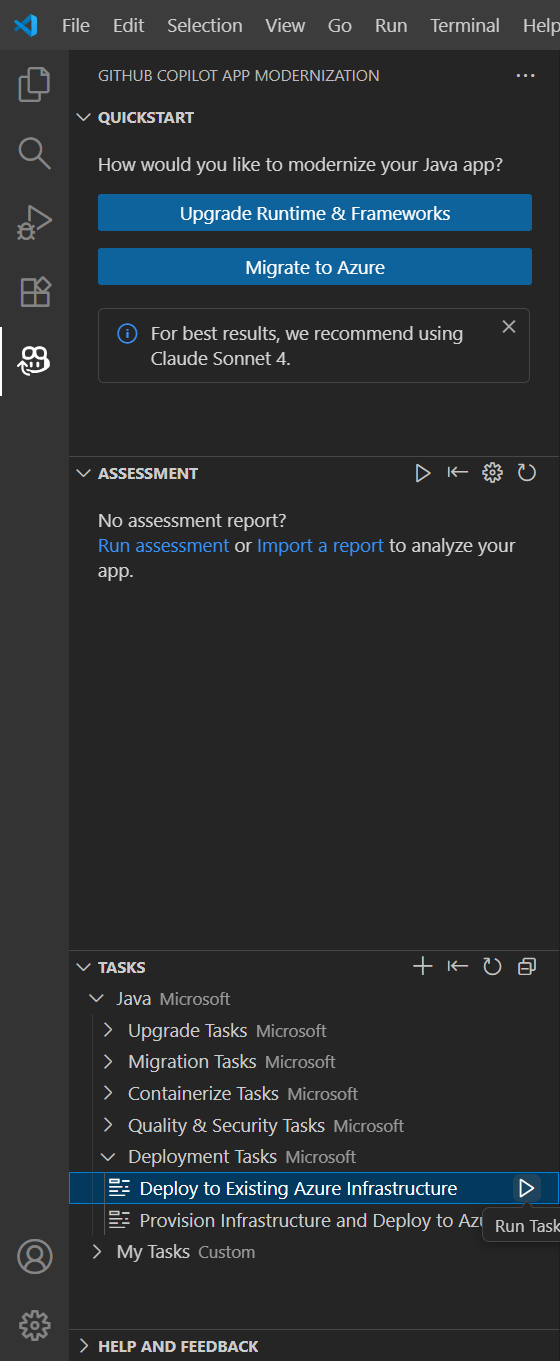 3. In the Tasks section, open Java, then open Deployment Tasks and select Deploy to Existing Azure Infrastructure or Provision Infrastructure and Deploy to Azure.