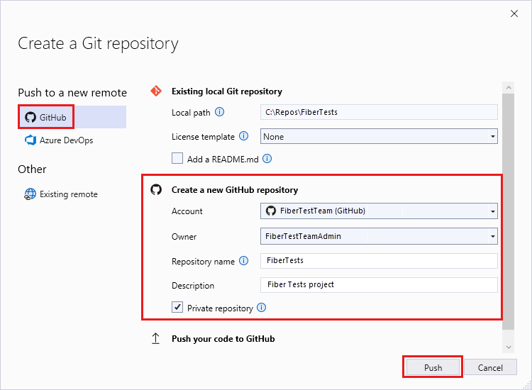 2. In the Create a Git repository dialog, select GitHub. Enter any required values under Create a new GitHub repository. Then select Push.