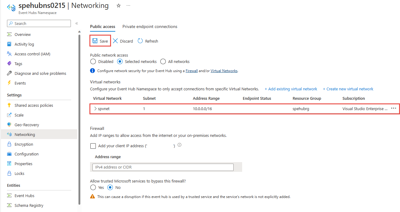 If you choose Selected networks, add at least one IP firewall rule or a virtual network that can access your namespace. Choose Disabled if you want to restrict all traffic to this namespace over private endpoints only.