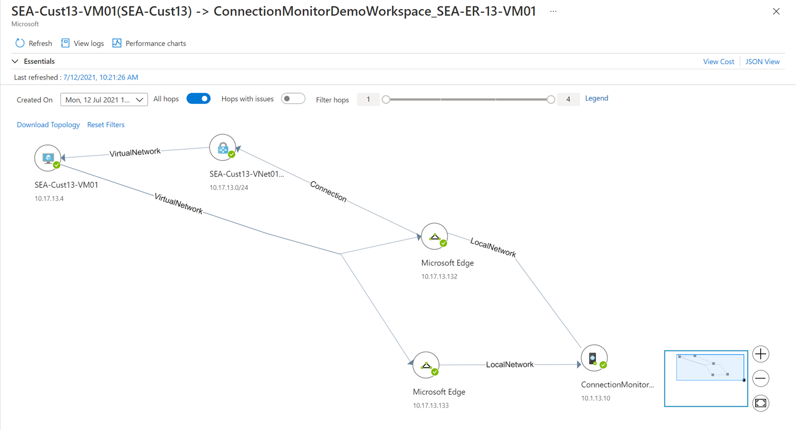 Go to your Network Watcher resource and select Connection monitor under Monitoring. You should see your new connection monitor after 5 minutes. To view the connection monitor's network topology and performance charts, select the test from the test group dropdown.