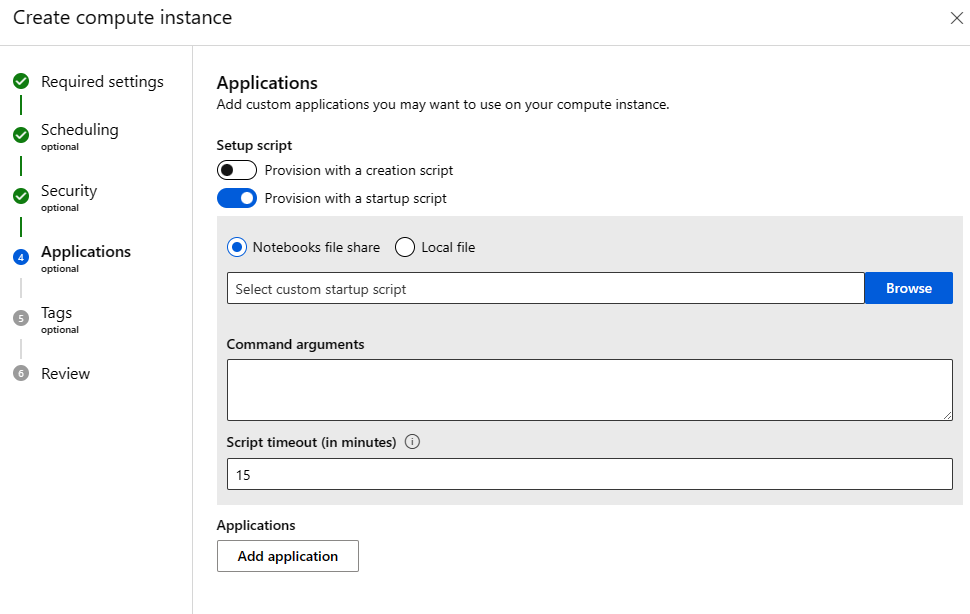 5. On the Applications page of the form, toggle on the type of script you want to use, creation script (run once when creating the compute instance) or startup script (run every time the compute instance is started).