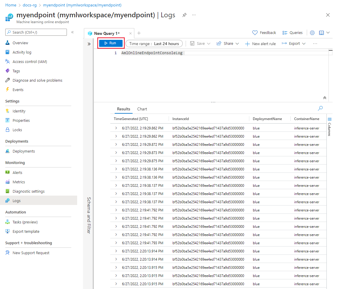 - Go to the properties page for your online endpoint. Under Monitoring, select Logs.