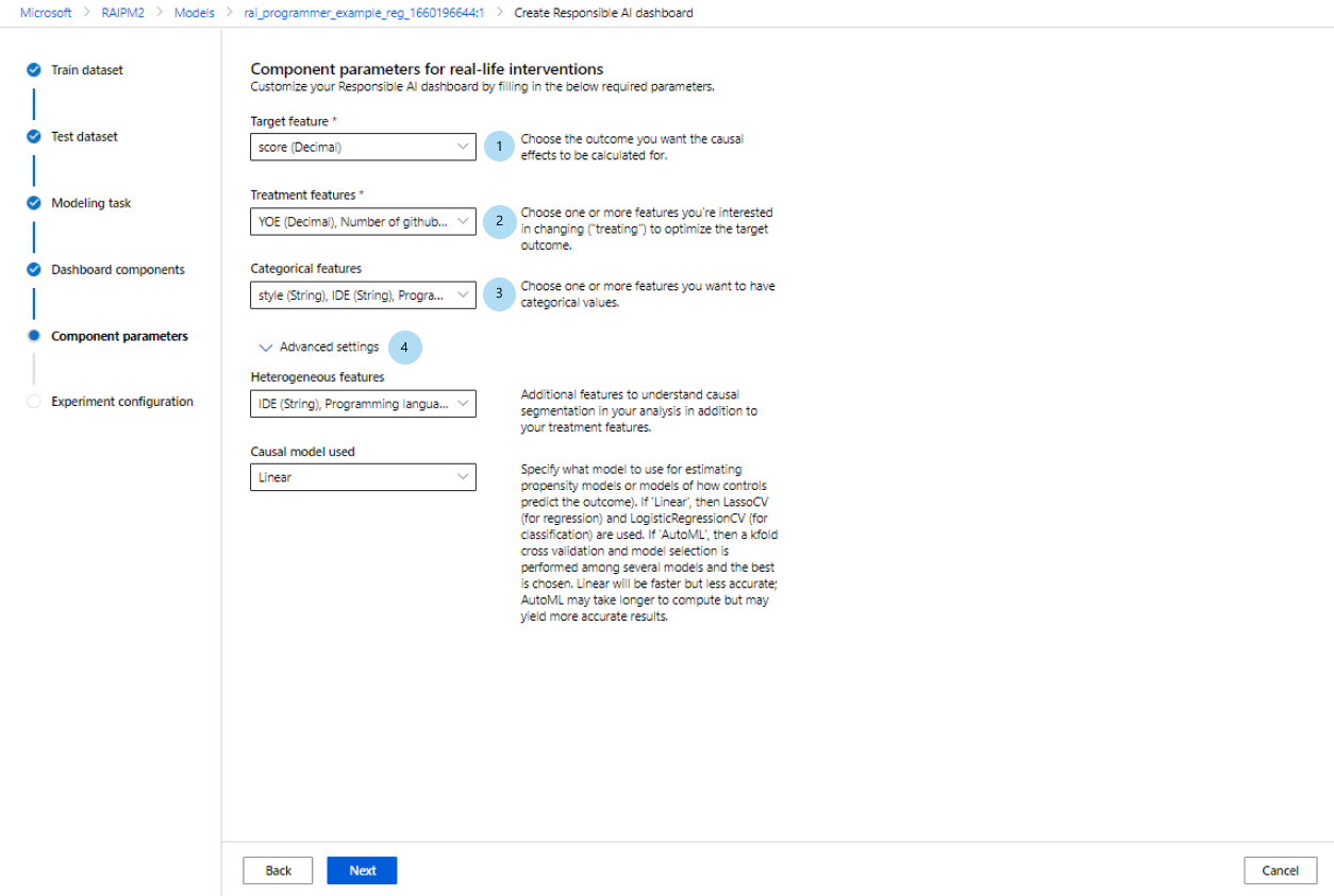 4. Advanced settings: Specify additional parameters for your causal analysis, such as heterogeneous features (that is, additional features to understand causal segmentation in your analysis, in addition to your treatment features) and which causal model you want to be used.