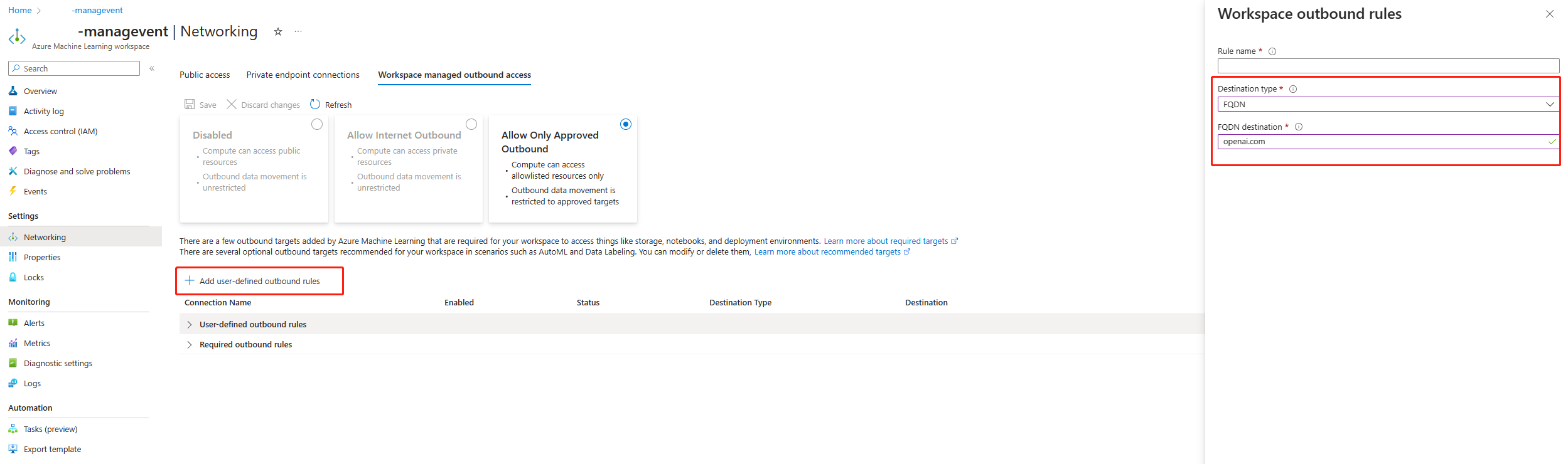 If you want to communicate with private Foundry Tools, you need to add related user-defined outbound rules to the related resource. The Azure Machine Learning workspace creates a private endpoint in the related resource with autoapproval. If the status is stuck in pending, go to the related resource to approve the private endpoint manually.
