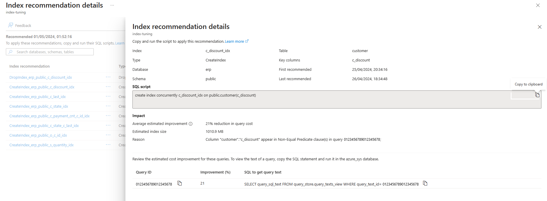 Execute queries on the recommendations view to retrieve the recommendations produced by index tuning for CREATE INDEX and DROP INDEX.