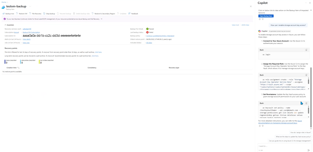 On the Copilot pane, select Open Backup Item to view the error code descriptions and recommendations with guided steps to fix issues.