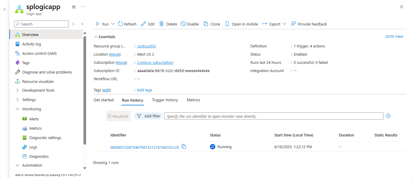 Navigate to the Overview page of your logic app. Then select the Run history tab in the bottom pane. You see the logic app runs messages that were sent to the topic. It could take a few minutes before you see the logic app runs. Select Refresh on the toolbar to refresh the page.