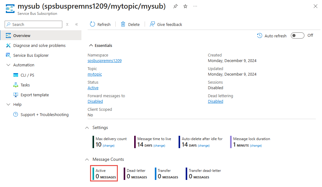 If you don't see any events on this page, verify that the Service Bus Subscription page doesn't show any Active message count. If the number for this counter is greater than zero, the messages at the subscription aren't forwarded to the handler function (event subscription handler) for some reason. Verify that you set up the event subscription properly.