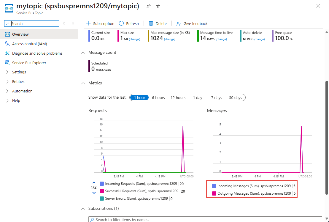 Confirm that the messages reached the Service Bus topic. See the incoming messages counter on the Service Bus Topic page. In this case, the MessageSender application runs once, so there are 5 messages.