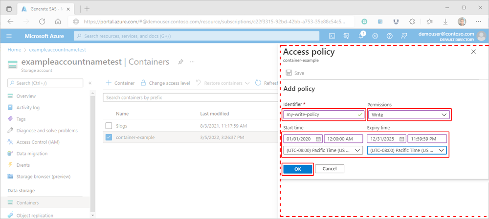 Configuring a stored access policy is a two-step process: the policy must first be defined, and then applied to the container afterward. To configure a stored access policy, follow these steps: